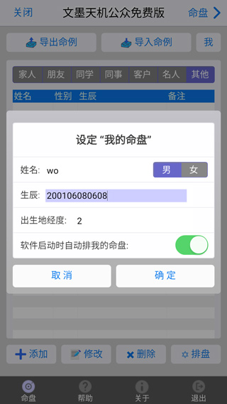 3、输入自己的性别、生辰、出生地经度等排盘信息,设置“我的命盘”。生辰时间是一串12位的数字,其录入结构是:四位“年"、两位“月”、两位“日"、两位“时”、两位“分”,例如2001年6月8日6点08分,录入即200106080608。出生地经度按自己实际的出生地经度填写即可。