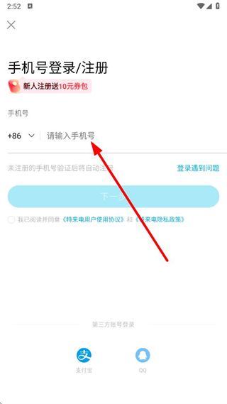 3、在手机号登录注册页面,输入要注册的手机号,勾选相关协议后点击下一步。