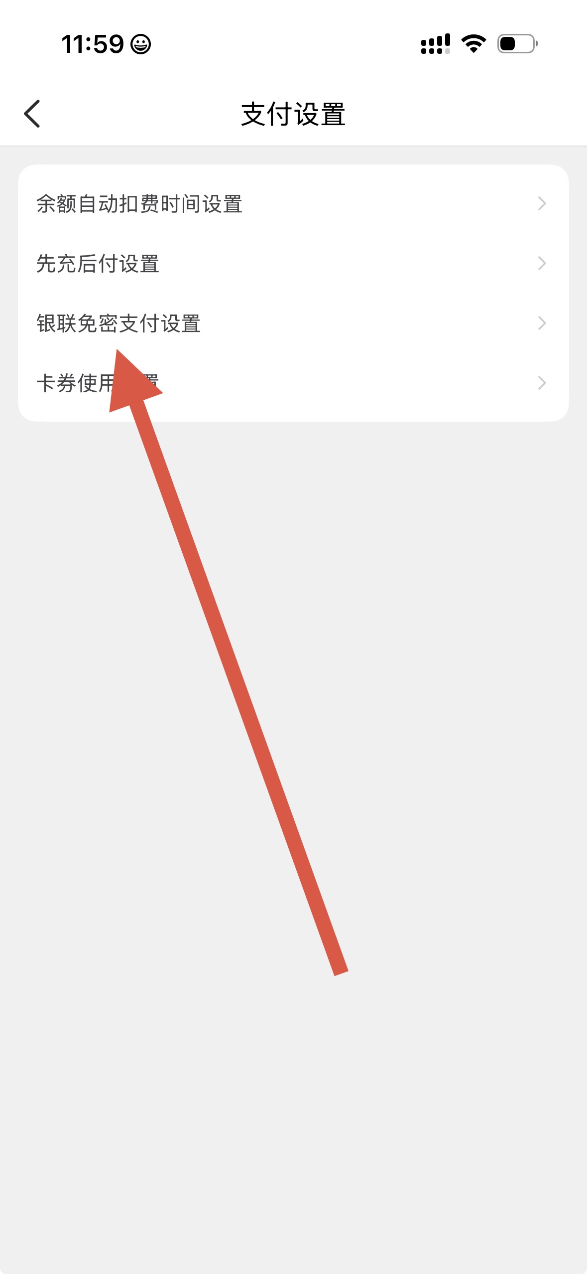 3、在支付设置页面里,选择银联免密支付设置等具体支付方式设置项。