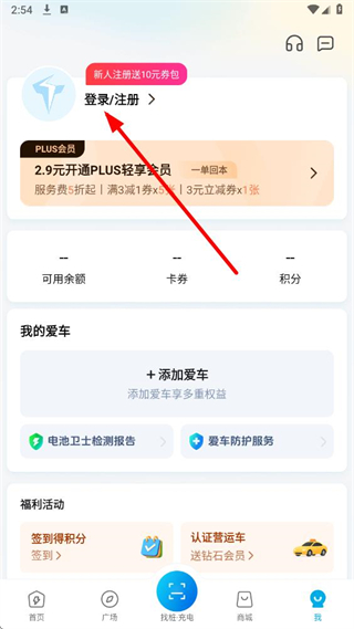 1、在特来电app我的页面,点击登录注册选项,进入手机号登录/注册页面。
