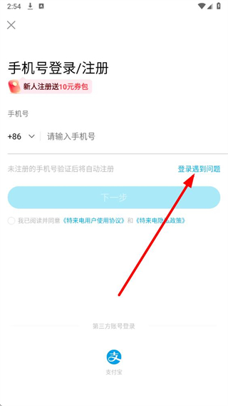 2、在手机号登录注册页面,点击登录遇到问题选项。