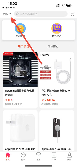 1、在e城e家首页,点击左上角城市选择区域,进入城市选择界面。