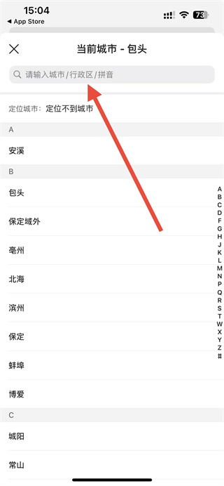 2、在城市选择界面,点击搜索框,输入想要修改的城市名称。