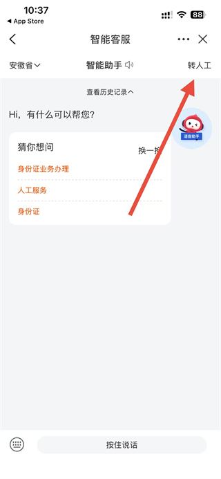 3、在智能客服界面的右上角,点击转人工按钮,即可联系到人工客服进行咨询。