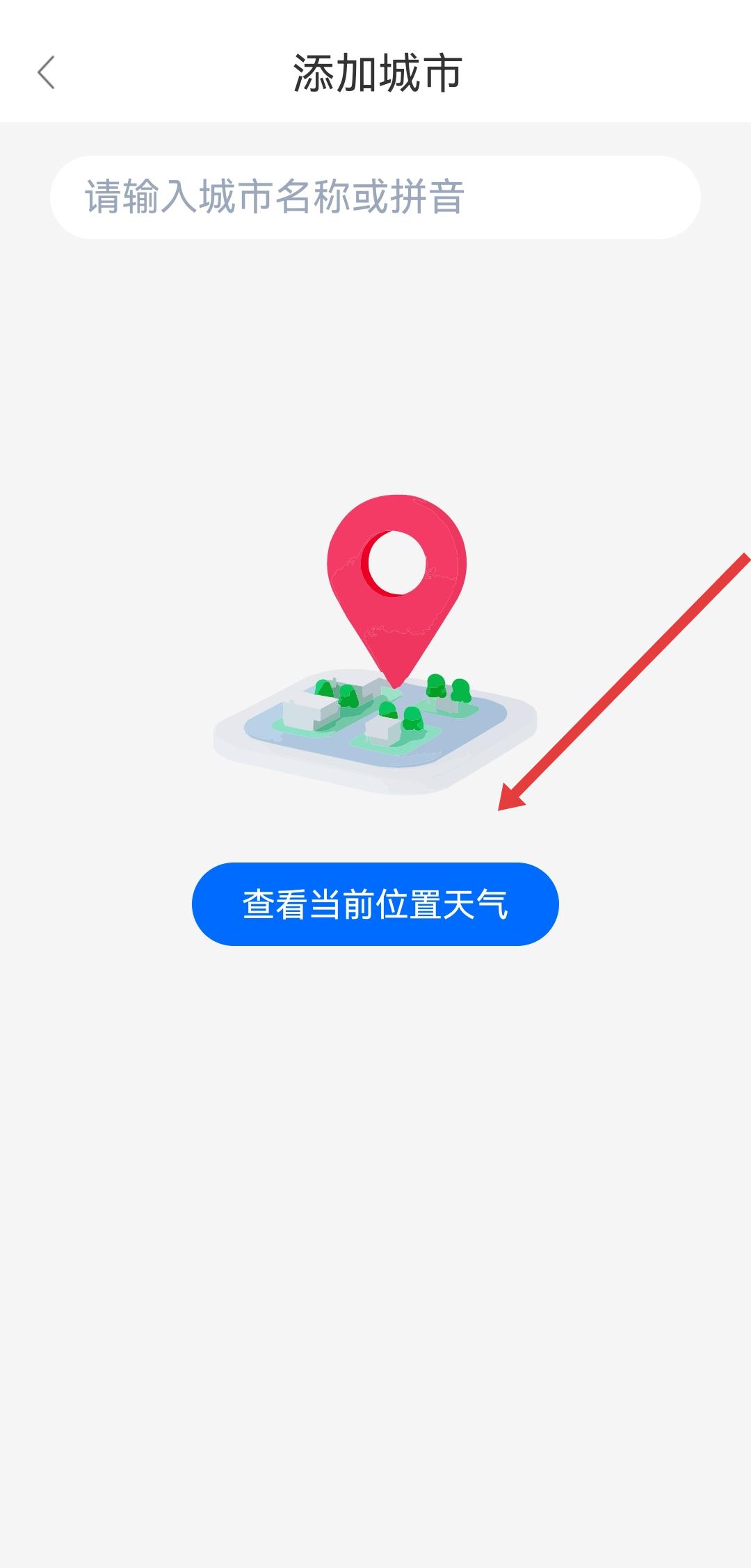 1、下载好360天气预报并打开,首页会弹出添加城市页面,点击查看当前位置天气按钮,触发定位功能。