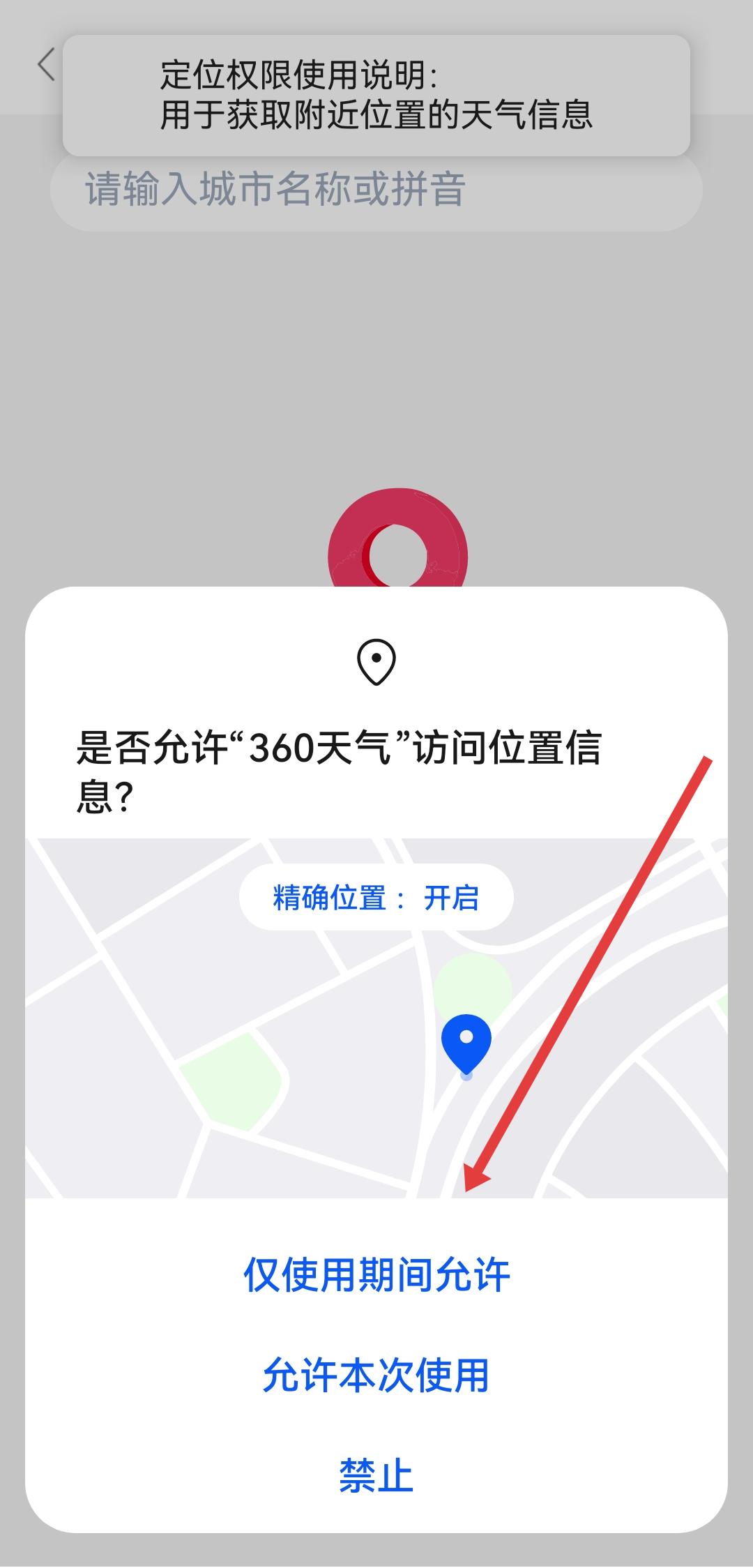 2、在弹出的位置权限请求框中,选择仅使用期间允许选项,授予应用精准定位权限。