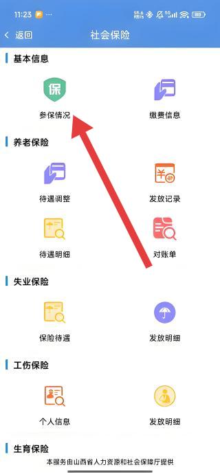 2、进入社会保险界面后,点击参保情况图标,跳转至参保情况详情页面,获取机关养老、企业养老等参保分类信息。