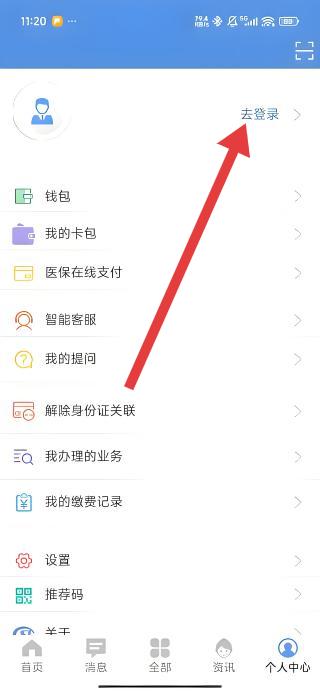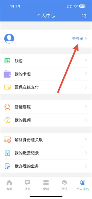 3、进入个人中心页面后,点击顶部去登录选项,跳转至登录界面,开始账号登录流程,以便使用医保支付等功能。