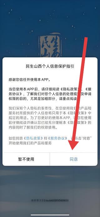 1、打开民生山西APP,弹出个人信息保护指引弹窗,点击同意按钮,接受隐私政策与服务协议,进入应用首页使用功能。