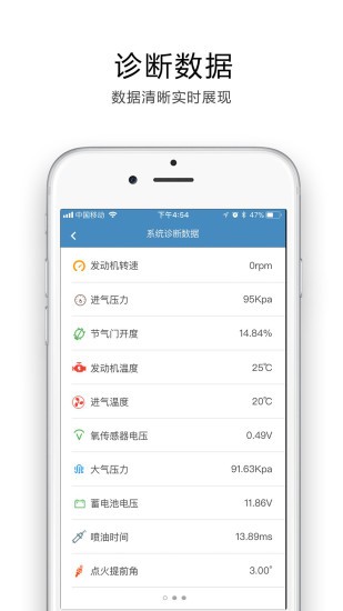 1、查看实时车况,显示油耗等行车数据,降低养车费用;