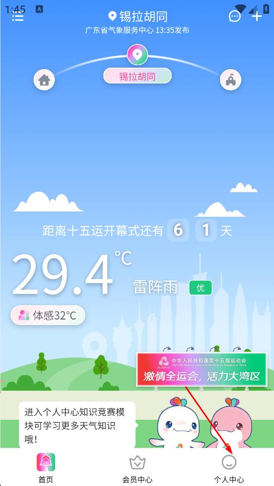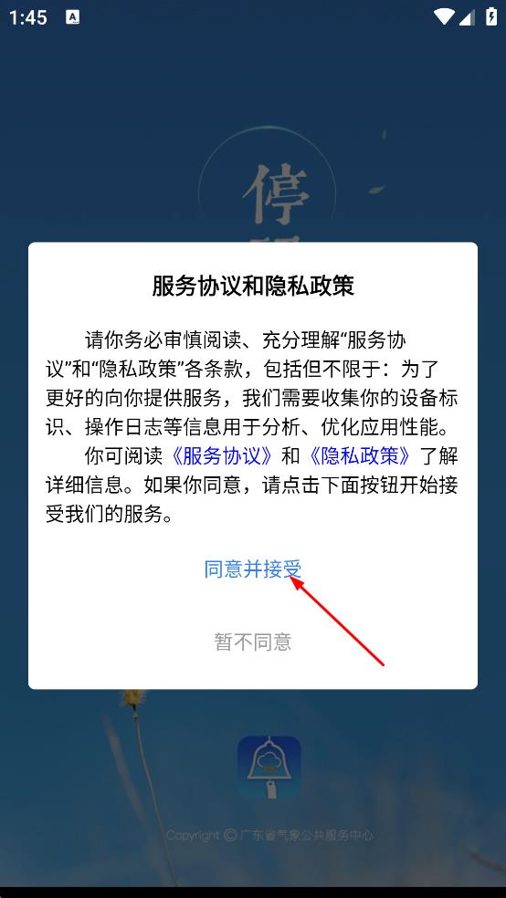 1、打开天气类APP,在弹出的服务协议和隐私政策页面,点击同意并接受,进入APP主界面后,点击右下角个人中心。