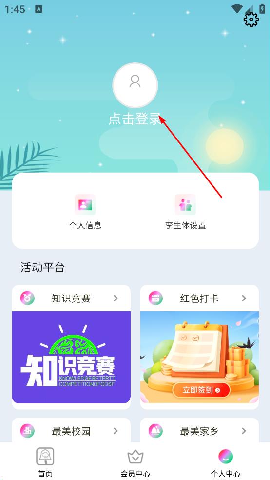 2、进入个人中心页面,在页面上方找到点击登录选项,点击该选项。