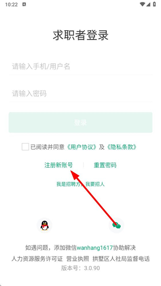2、在求职者登录界面,点击注册新账号,进入注册界面。