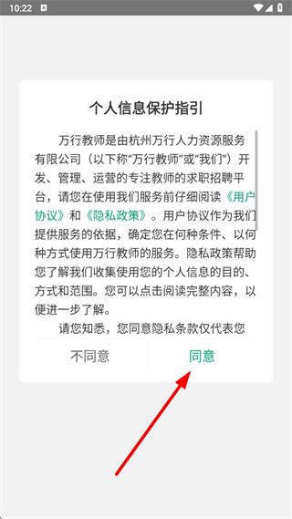 1、在万行教师app的个人信息保护指引界面,点击同意,进入求职者登录界面。