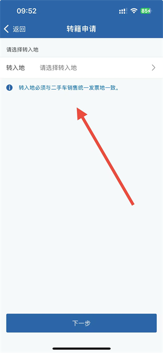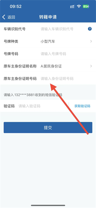 5、然后填写车辆信息,输入验证码后点击提交即可完成转籍申请。