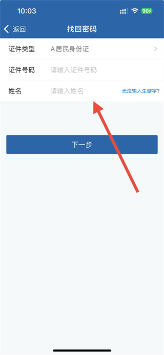2、在找回密码页面,选择证件类型为居民身份证,输入证件号码和姓名,点击下一步。