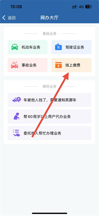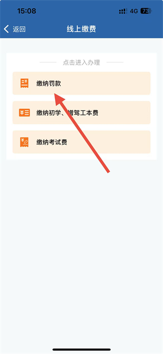 3、在线上缴费页面点击缴纳罚款选项,进入罚款缴纳页面。
