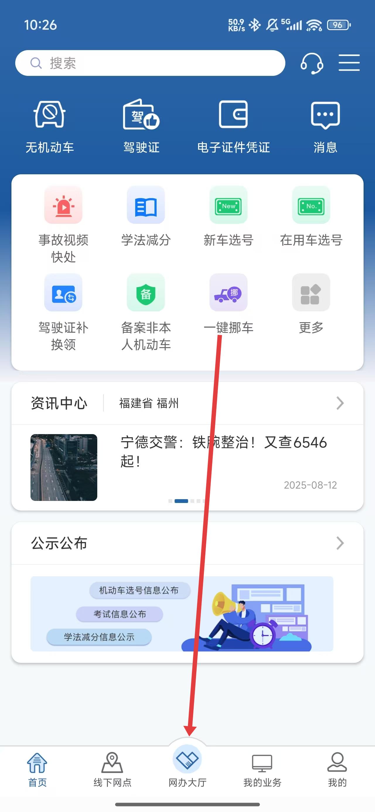 1、在交管12123app首页点击网办大厅选项,进入网办大厅页面。