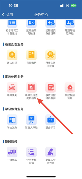2、在业务中心页面的事故处理业务板块中,点击事故处理进度和结果选项。