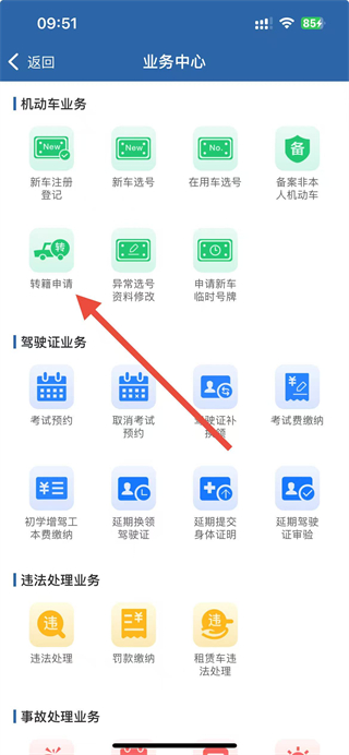 2、在业务中心的机动车业务板块,点击转籍申请选项。