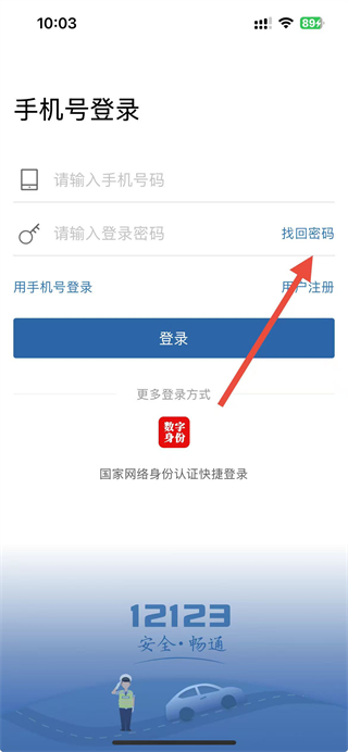 1、在交管12123登录页面,点击找回密码选项,进入找回密码页面。