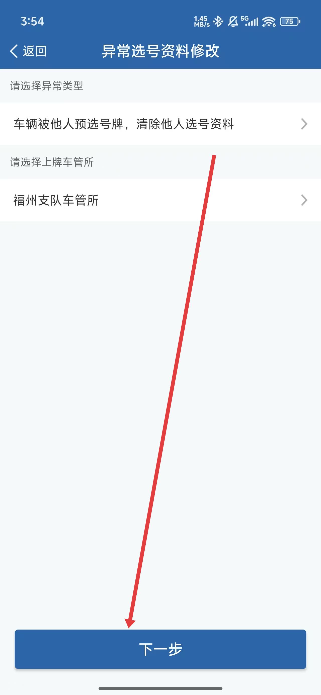4、在异常选号资料修改页面中,选择完异常类型后,点击下一步进入后续修改操作。