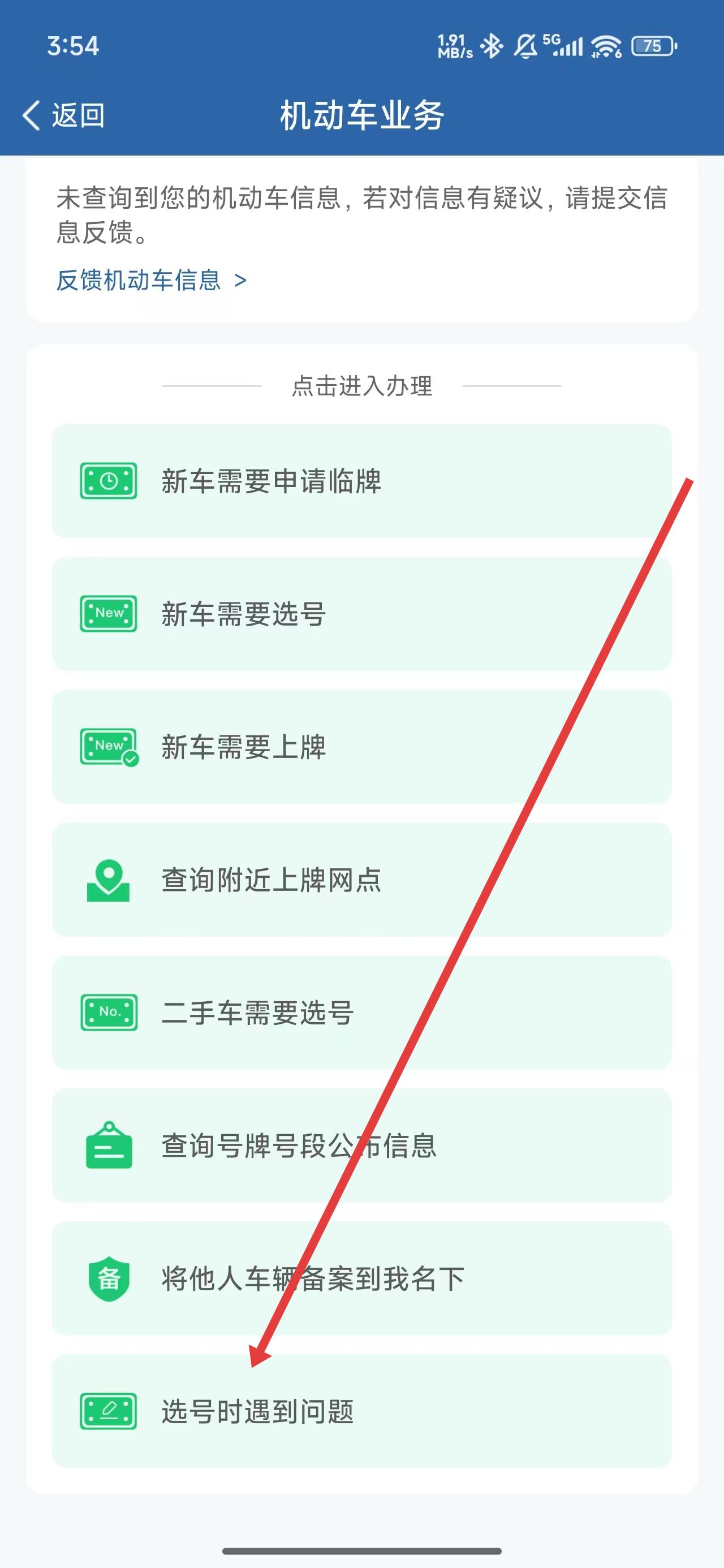 3、在机动车业务页面中,点击选号时遇到困难业务选项,进入修改选号资料。