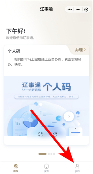 1、打开辽事通APP,点击底部导航栏的我的选项,进入个人页面。