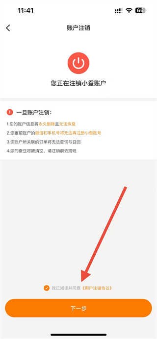 4、在账户注销页面,勾选同意用户注销协议后点击下一步,按照提示完成后续操作即可注销账号。